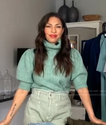 on Today on NBC was spotted wearing this green turtleneck sweater on Today on Apr 07 2021's episode. 's Sweater is the Turtleneck Puff Sleeve Sweater by Mango.