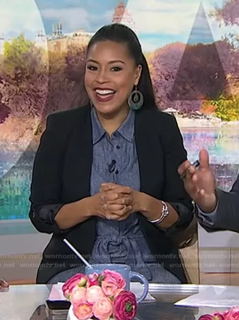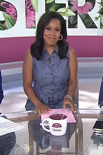 Sheinelle Jones on Today on NBC was spotted wearing this blue sleeveless jumpsuit on Today on Nov 15 2022's episode. Sheinelle's Jumpsuit is the Tie-Front Linen Blend Jumpsuit by Banana Republic.