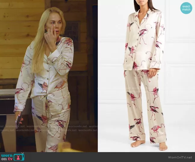Kameron Westcott on The Real Housewives of Dallas on Bravo was spotted wearing this white flamingo print pajamas on The Real Housewives of Dallas on episode 'Bigfoot, Bigger Drama' (5x13) in Apr 2021. Kameron's Pajamas is the Lila Printed Silk-Satin Pajama Set by Olivia von Halle.
