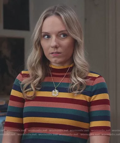 (played by ) on Good Trouble on Freeform was spotted wearing this rainbow stripe mock neck top on Good Trouble on episode 'Trust' (3x08) in Apr 2021. 's Top is the Ribbed Mockneck Top in Rainbow Stripe by Madewell.
