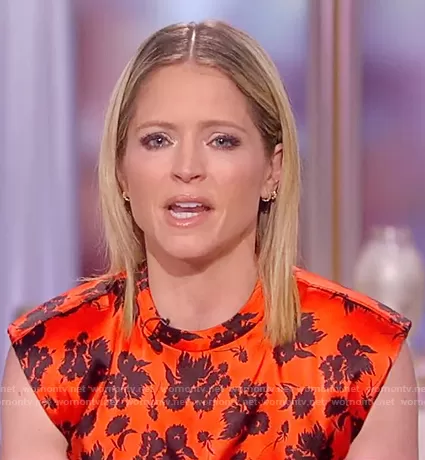 Sara Haines on The View on ABC was spotted wearing this orange floral ruched top on The View on Apr 08 2021's episode. Sara's Top is the Floral stretch-silk satin top by Ganni.