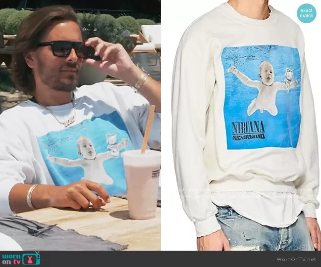 on Keeping Up with the Kardashians on E! was spotted wearing this white Nirvana graphic sweatshirt on Keeping Up with the Kardashians on episode 'New Friends and the Bunker' (20x04) in Apr 2021. 's Sweater is the Nirvana Nevermind Sweatshirt by Madeworn.