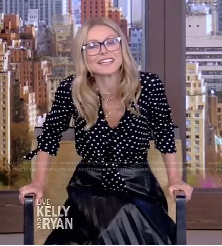 Kelly Ripa on Live with Kelly and Mark on Disney ABC Home Entertainment was spotted wearing this black polka dot blouse and pleated skirt on Live with Kelly and Ryan on Apr 09 2021's episode. Kelly's Top is the Polka Dot Silk Georgette Blouse by Valentino . Kelly's Skirt is the Pleated Faux Leather Midi Skirt by MM6 Maison Margiela.
