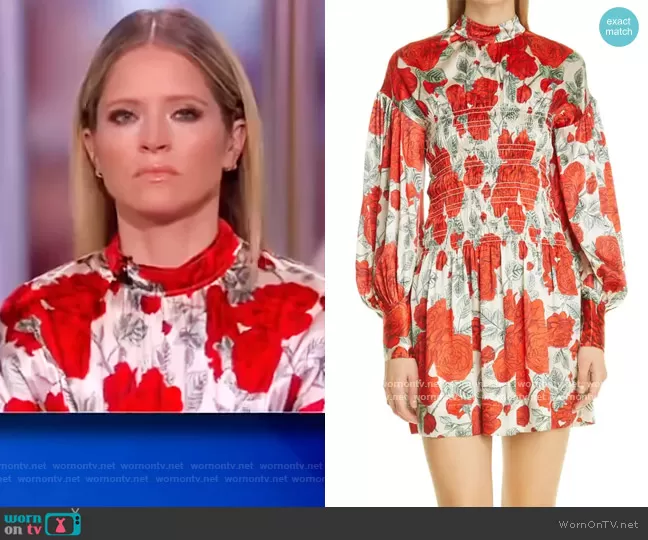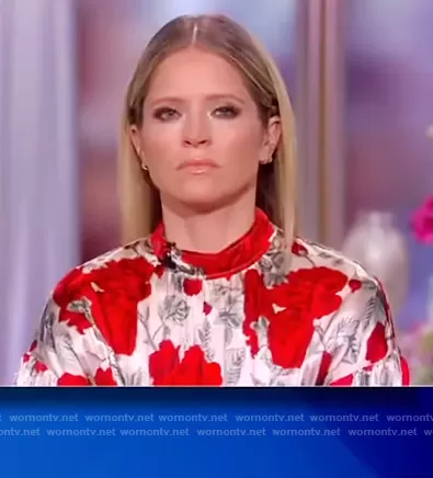 Sara Haines on The View on ABC was spotted wearing this satin floral print dress on The View on Apr 12 2021's episode. Sara's Dress is the Floral Long Sleeve Stretch Silk Satin Dress by Ganni.