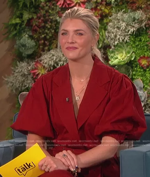 Amanda Kloots on The Talk on CBS was spotted wearing this red belted jacket on The Talk on Apr 12 2021's episode. Amanda's Jacket is the Lantern Cocoon Belted Coat by Toccin . Amanda's Pants is the Flare Cropped Pants by Toccin.