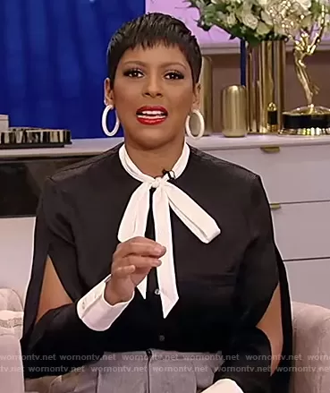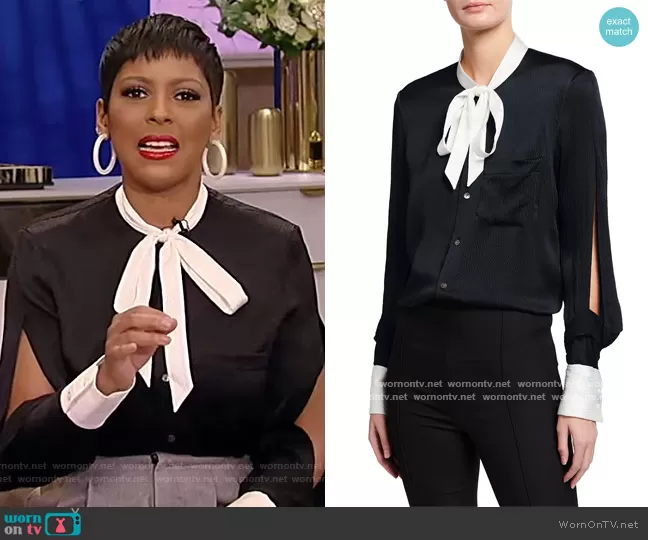 Tamron Hall on Tamron Hall Show on ABC was spotted wearing this black tie neck blouse with split sleeves on Tamron Hall Show on Apr 12 2021's episode. Tamron's Top is the Isleham hammered-satin blouse by Roland Mouret . Tamron's Pants is the Pleated wool-twill tapered pants by Saint Laurent.