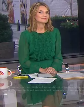 Savannah Guthrie on Today on NBC was spotted wearing this green ruffled chiffon dress on Today on Apr 12 2021's episode. Savannah's Dress is the Asymmetric Ruffled Chiffon Dress by Jason Wu.