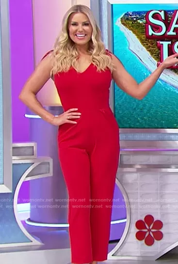 Rachel Reynolds on The Price is Right on CBS was spotted wearing this red tie shoulder jumpsuit on The Price is Right on Dec 08 2023's episode. Rachel's Jumpsuit is the Maira Tie Shoulder Crepe Jumpsuit by Dress the Population.