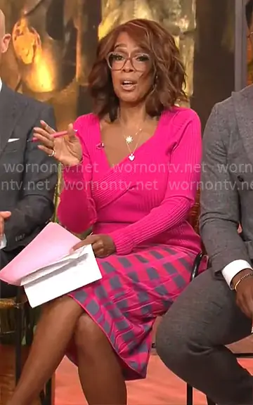 Gayle King on CBS Mornings on CBS was spotted wearing this pink asymmetric sweater and checked skirt on CBS Mornings on Apr 09 2026's episode. Gayle's Sweater is the Asymmetrical Rib Sweater in Jazzy Pink by INC International Concepts . Gayle's Skirt is the Rosa Skirt in Pink Gray Gingham by Diane von Furstenberg .