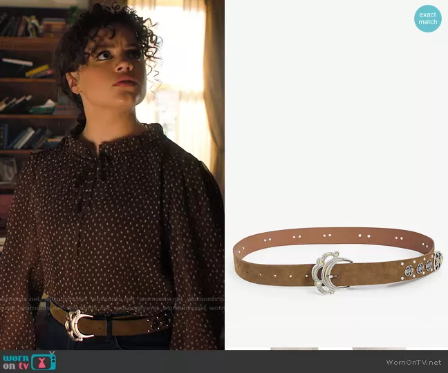 Maggie Vera (played by Sarah Jeffery) on Charmed on The CW was spotted wearing this brown dotted blouse on Charmed on episode 'No Hablo Brujeria' (3x09) in Apr 2021. Maggie's Top is the Pleated Georgette Blouse by Ganni . Maggie's Belt is the Tabac Belt in Tobacco by Maje.
