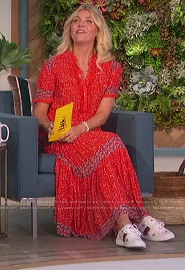 Amanda Kloots on The Talk on CBS was spotted wearing this red floral print dress on The Talk on Apr 13 2021's episode. Amanda's Dress is the Rare Feeling Maxi Dress by Free People . Amanda's Shoes is the New Ace Sneakers With Bees And Stars by Gucci.