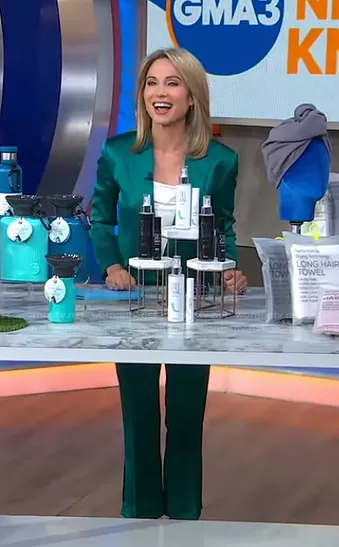 Amy Robach on Good Morning America on ABC was spotted wearing this green satin blazer and pants on Good Morning America on Apr 14 2021's episode. Amy's Jacket is the Satin Blazer by The Kooples . Amy's Pants is the High-Rise Slit-Detail Satin Trousers by The Kooples.