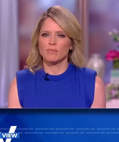 Sara Haines on The View on ABC was spotted wearing this blue sleeveless dress on The View on Apr 14 2021's episode. Sara's Dress is the Yuki Strong Shoulder Pleated Midi Dress by Alice + Olivia.