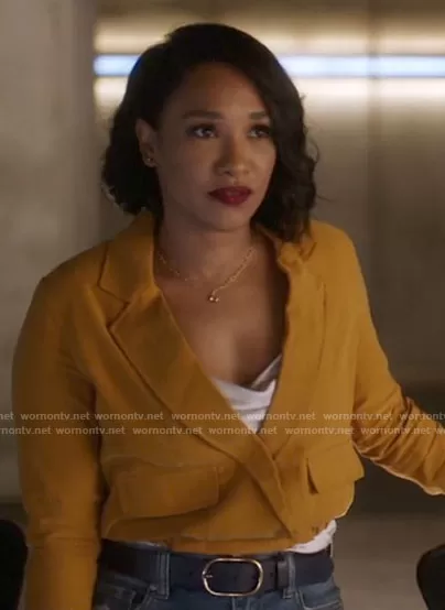 Iris West (played by Candice Patton) on The Flash on The CW was spotted wearing this yellow cropped jacket on The Flash on episode 'The One with the Nineties' (7x06) in Apr 2021. Iris's Jacket is the Notch Lapel Cargo Jacket by Dex .