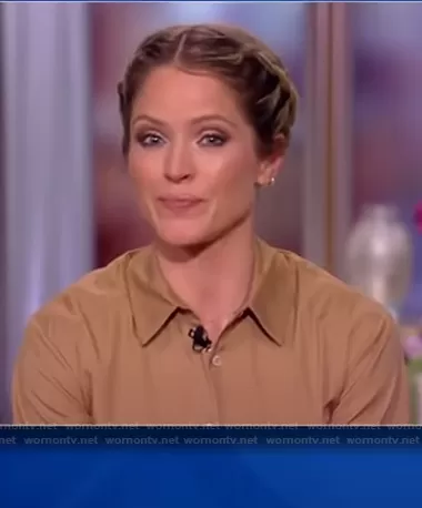 Sara Haines on The View on ABC was spotted wearing this beige shirtdress on The View on Apr 15 2021's episode. Sara's Dress is the Luriane Bell Sleeve Minidress by Veronica Beard.