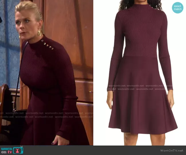 Sami Brady (played by Alison Sweeney) on Days of our Lives on Peacock was spotted wearing this burgundy button detail ribbed dress on Days of our Lives on Apr 16 2021's episode. Sami's Dress is the Button Detail Long Sleeve Skater Dress by Ted Baker.