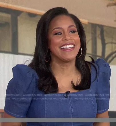 Sheinelle Jones on Today on NBC was spotted wearing this denim puff sleeve dress on Today on Apr 19 2021's episode. Sheinelle's Dress is the Candelaria Denim Dress by Shoshanna.