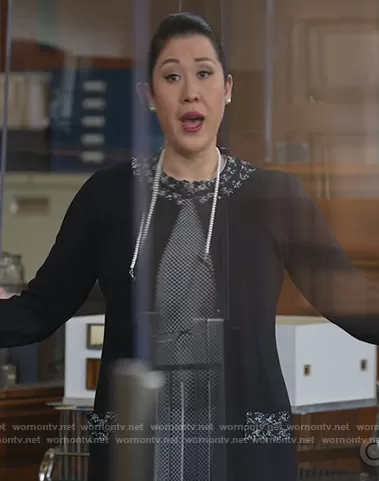 Sherri Kansky (played by Ruthie Ann Miles) on All Rise on OWN was spotted wearing this navy tweed trim coat on All Rise on episode 'Chasing Waterfalls' (2x12) in Apr 2021. Sherri's Coat is the Frankie Tweed Trim Coatigan by Hobbs.