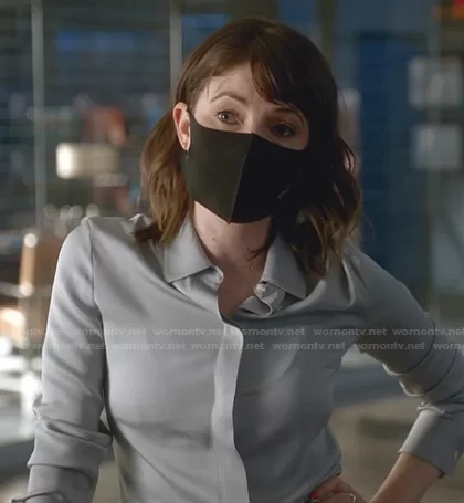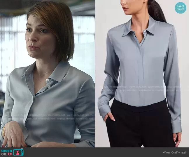 Taylor Rentzel (played by MacKenzie Meehan) on Bull on CBS was spotted wearing this blue button down shirt on Bull on episode 'Caliban' (6x12) in Feb 2022. Taylor's Top is the Fitted Shirt in Stretch Silk by Theory.