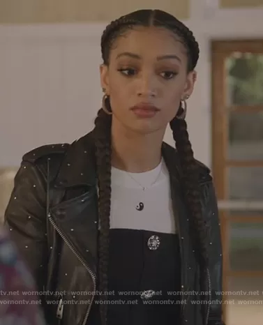 Laura Baker (played by Monet Mazur) on All American on CWTV was spotted wearing this white yin yang print tee on All American on episode 'Put Up or Shut Up' (3x10) in Apr 2021. Laura's Top is the Embroidered Yin Yang Easy Crop Tee by Madewell . Laura's Jacket is the Balfern Studded Leather Biker Jacket by AllSaints.
