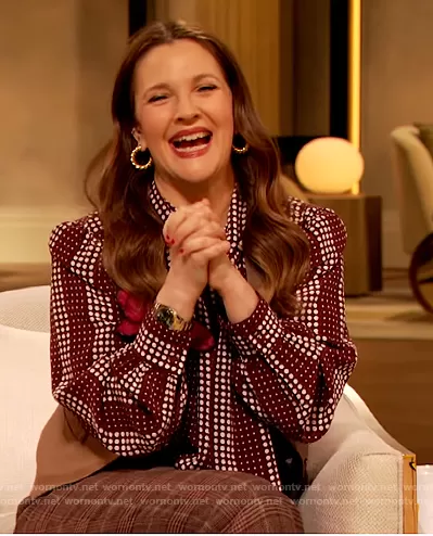 Drew Barrymore on The Drew Barrymore Show on CBS was spotted wearing this red dotted tie neck blouse on The Drew Barrymore Show on Apr 20 2021's episode. Drew's Top is the Spotted Silk Pussy Bow Blouse by Ports 1961 . Drew's Pants is the Flore High-Waisted Cashmere Check Pants by Akris . Drew's Vest is the Toluca Wool and Cashmere Blend Vest by Gauge81.