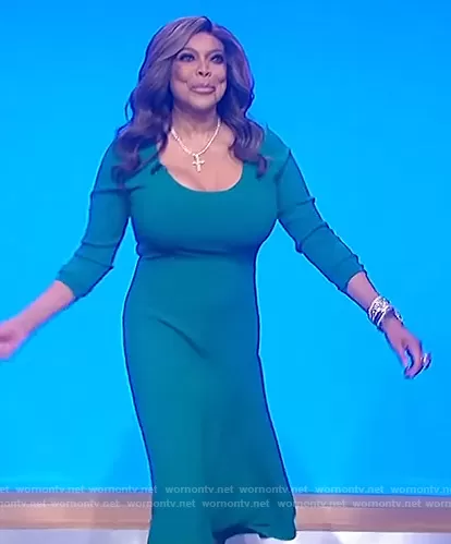 Wendy Williams on The Wendy Williams Show on Various was spotted wearing this teal scoop neck dress on The Wendy Williams Show on Apr 20 2021's episode. Wendy's Dress is the Olivia Scoopneck Knit Midi Dress by A.L.C..