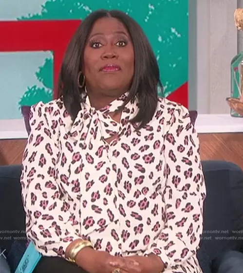 Sheryl Underwood on The Talk on CBS was spotted wearing this white leopard print blouse on The Talk on Apr 20 2021's episode. Sheryl's Top is the Tie Neck Blouse by Eloquii.
