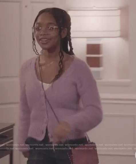 Diane Johnson (played by Marsai Martin) on Black-ish on ABC was spotted wearing this purple fuzzy cardigan on Black-ish on episode 'My Dinner with Andre Junior' (7x16) in Apr 2021. Diane's Sweater is the Mistigri V Neck Mohair Cardigan by Maje.