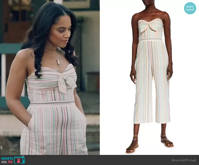 Darla (played by Bianca Lawson) on Queen Sugar on OWN was spotted wearing this striped strapless jumpsuit on Queen Sugar on episode 'Onward' (5x10) in Apr 2021. Darla's Jumpsuit is the Bohemia Strapless Jumpsuit by Parker.