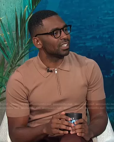 Justin Sylvester on E! News on E! was spotted wearing this camel quarter zip polo shirt on E! News Daily Pop on Apr 22 2021's episode. Justin's Shirt is the Maxwell Zip Wool Polo by Reiss.