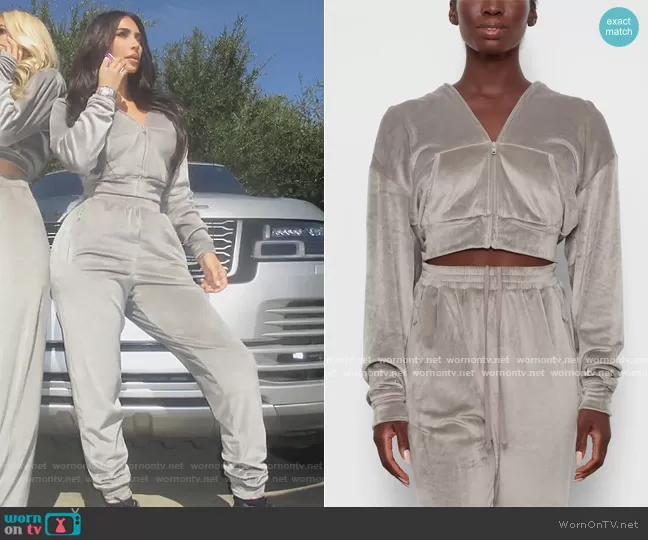 Kim Kardashian on Keeping Up with the Kardashians on E! was spotted wearing this gray cropped velvet hoodie on Keeping Up with the Kardashians on episode 'Summer of Love' (20x06) in Apr 2021. Kim's Sweater is the Velour Hoodie by Skims . Kim's Pants is the Velour track pants by Skims.
