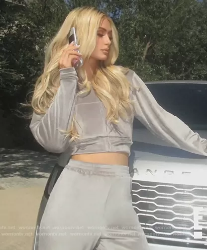 on Keeping Up with the Kardashians on E! was spotted wearing this gray cropped hoodie on Keeping Up with the Kardashians on episode 'Summer of Love' (20x06) in Apr 2021. 's Sweater is the Velour Hoodie by Skims . 's Pants is the Velour track pants by Skims.