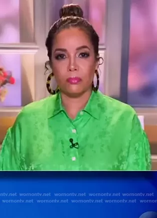 Sunny Hostin on The View on ABC was spotted wearing this green floral satin blouse on The View on Apr 23 2021's episode. Sunny's Top is the Ruffled silk-jacquard shirt by Les Reveries.