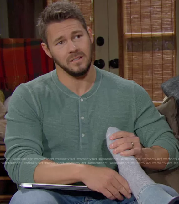Liam Spencer (played by Scott Clifton) on The Bold and the Beautiful on CBS was spotted wearing this green henley shirt on The Bold and the Beautiful on Jan 17 2022's episode. Liam's Shirt is the Waffle Knit Henley by Ralph Lauren.