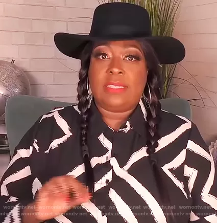 Loni Love on The Real on BETher was spotted wearing this black printed tie waist dress on The Real on Apr 24 2021's episode. Loni's Dress is the Stripe Semi Sheer Duster Button Up by Ashley Stewart.