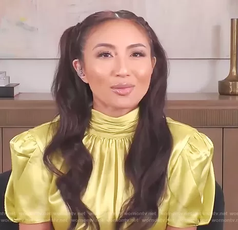 Jeannie Mai on The Real on BETher was spotted wearing this yellow satin mock neck top on The Real on Apr 24 2021's episode. Jeannie's Top is the Justine Silk Top by Cinq a Sept.