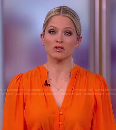 Sara Haines on The View on ABC was spotted wearing this orange button down dress on The View on Apr 26 2021's episode. Sara's Dress is the Roksanda Handkerchief Hem Silk Blend Dress by Veronica Beard.