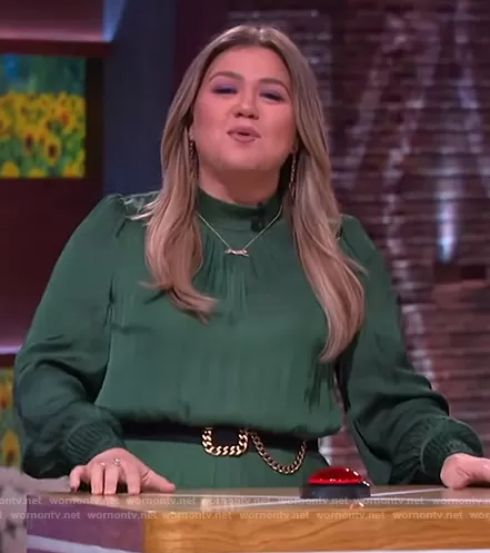 Kelly Clarkson on The Kelly Clarkson Show on NBC was spotted wearing this green mock neck dress on The Kelly Clarkson Show on Apr 22 2021's episode. Kelly's Dress is the Flowy puffed-sleeve dress by Mango.