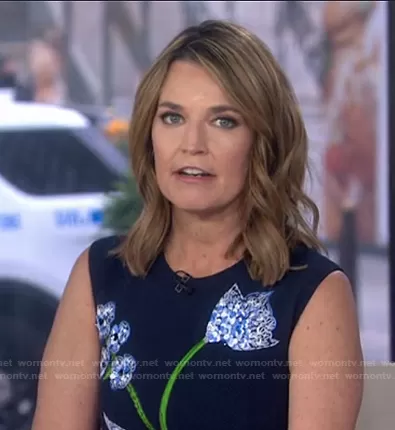 Savannah Guthrie on Today on NBC was spotted wearing this navy floral embroidered dress on Today on Apr 27 2021's episode. Savannah's Dress is the Floral-Embroidered Dress by Lela Rose.