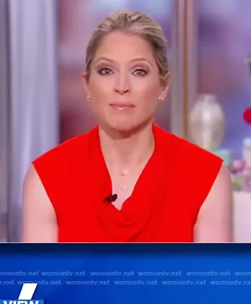 Sara Haines on The View on ABC was spotted wearing this red drape neck top on The View on Apr 27 2021's episode. Sara's Top is the Asymmetric draped merino wool top by Proenza Schouler.