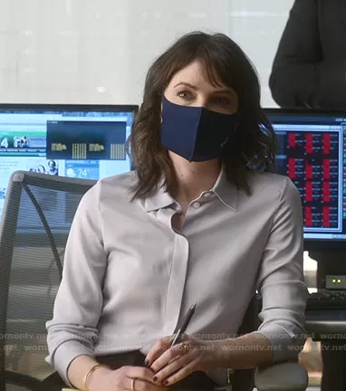Taylor Rentzel (played by MacKenzie Meehan) on Bull on CBS was spotted wearing this grey button down satin shirt on Bull on episode 'The Law of the Jungle' (5x13) in Apr 2021. Taylor's Top is the Classic Fitted Shirt by Theory.