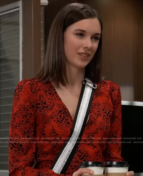 Willow Tait (played by Katelyn MacMullen) on General Hospital on ABC was spotted wearing this red printed blouse on General Hospital on Apr 28 2021's episode. Willow's Top is the Button Front Blouse by Leith.