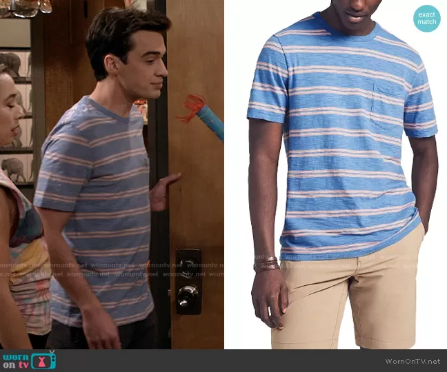 Freddie Raine (played by Joey Bragg) on Call Your Mother on ABC was spotted wearing this blue striped t-shirt on Call Your Mother on episode 'The Raines Games' (1x12) in May 2021. Freddie's Shirt is the Sunwash Stripe T-Shirt in Coastal Coral Stripe by Faherty . Freddie's Shoes is the Core Slip-On Sneaker by Vans.