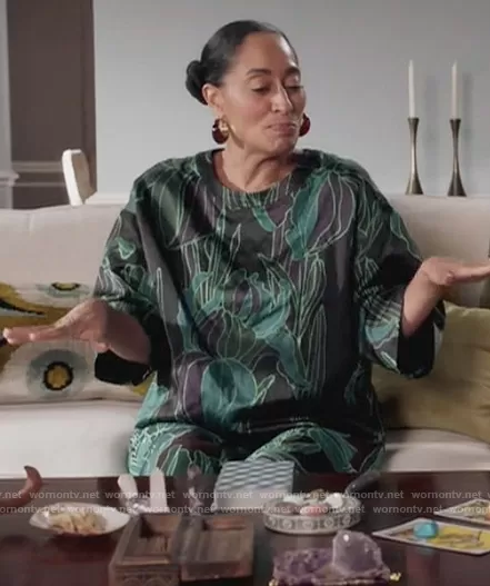 Rainbow Johnson (played by Tracee Ellis Ross) on Black-ish on ABC was spotted wearing this floral print blouse and pants on Black-ish on episode 'Missions & Ambitions' (7x17) in Apr 2021. Rainbow's Top is the Cartasy Swing Top Dries Van Noten . Rainbow's Pants is the Floral Print Woven Wide Leg Pants by Dries Van Noten.