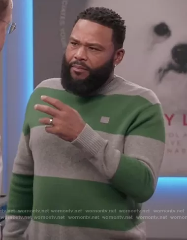 Andre Johnson (played by Anthony Anderson) on Black-ish on ABC was spotted wearing this gray and green stripe sweater on Black-ish on episode 'Missions & Ambitions' (7x17) in Apr 2021. Andre's Sweater is the Nimah Block Stripe Sweater by Acne Studios.