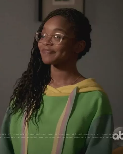 Diane Johnson (played by Marsai Martin) on Black-ish on ABC was spotted wearing this green croped hoodie on Black-ish on episode 'Missions & Ambitions' (7x17) in Apr 2021. Diane's Sweater is the Dalia Cropped Hoodie by Out From Under.