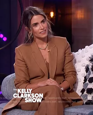 on The Kelly Clarkson Show on NBC was spotted wearing this brown blazer and pants on The Kelly Clarkson Show on Apr 27 2021's episode. 's Blazer is the Double Breasted Linen Jacket by Another Tomorrow . 's Pants is the Paper Bag Pleated Trouser by Another Tomorrow.