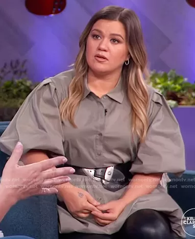 Kelly Clarkson on The Kelly Clarkson Show on NBC was spotted wearing this gray puff sleeve mini dress on The Kelly Clarkson Show on Apr 28 2021's episode. Kelly's Dress is the Cleo Balloon Skirt Poplin Shirtdress by Jonathan Simkhai.