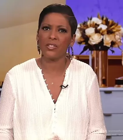Tamron Hall on Tamron Hall Show on ABC was spotted wearing this white pearl embellished top on Tamron Hall Show on Apr 28 2021's episode. Tamron's Top is the Pearl Top by Zara.