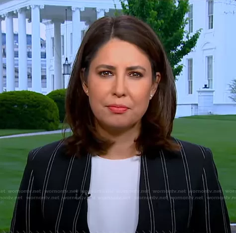 Cecilia Vega on Good Morning America on ABC was spotted wearing this black striped collarless blazer on Good Morning America on May 19 2021's episode. Cecilia's Jacket is the Natanielle Stripe Collarless Linen Blend Blazer by Sandro.
